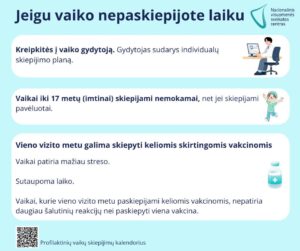 Jei savo vaiko nespėjote paskiepyti laiku, bet norite tai padaryti – kreipkitės į šeimos gydytoją dėl individualaus skiepijimo plano sudarymo.